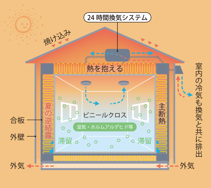 夏は、壁の中の空気を流して室内の空気を快適に保ち、