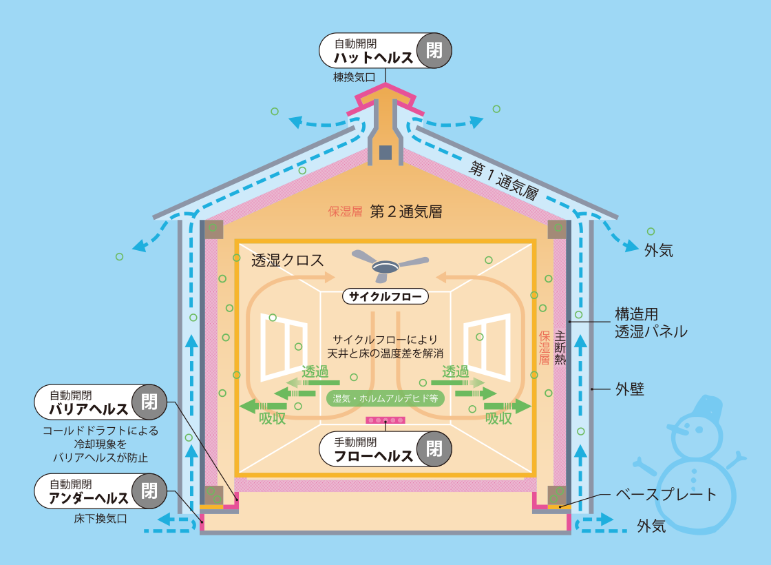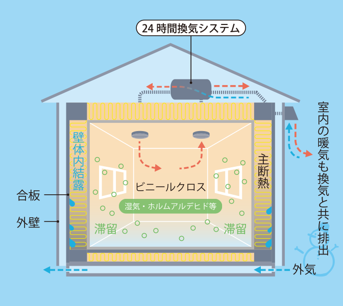 化学物質や臭いが溶け込んだ湿気が室内側の壁を透過し、壁内の上昇気流に乗って屋外に排出されます。